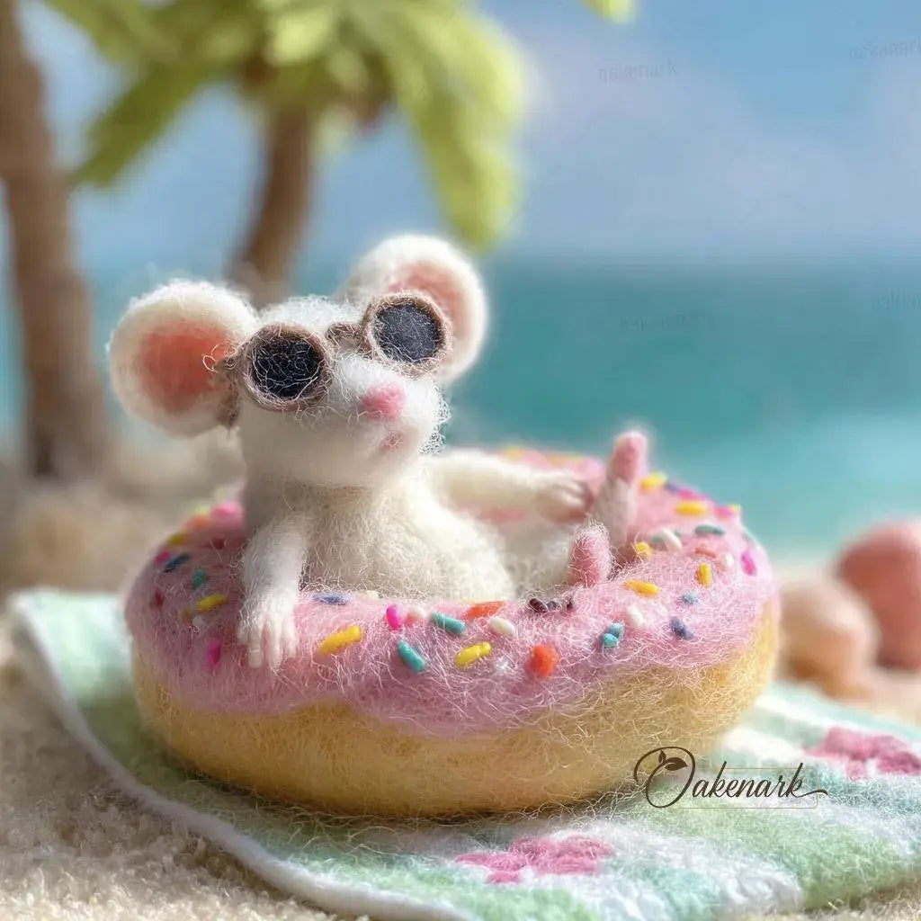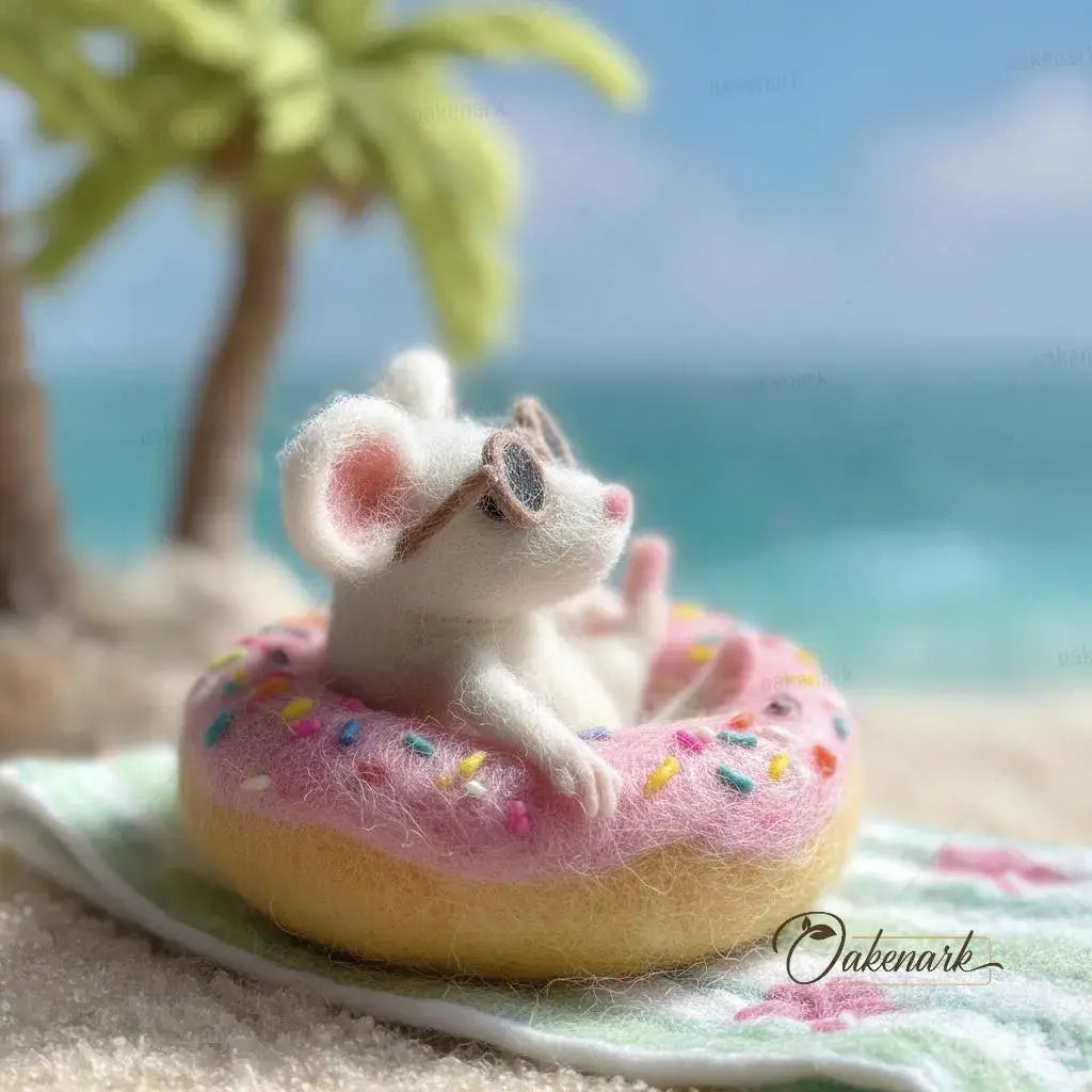 Capture the essence of a perfect summer getaway with the Beach Mouse in Donut Floatie. This handcrafted needle felted art piece is an OakenArk original designed to bring a touch of whimsical relaxation to any space. Every piece is uniquely sculpted by hand using 100 percent natural wool felt ensuring a premium artisan quality and a soft, inviting texture that celebrates sustainable craftsmanship.