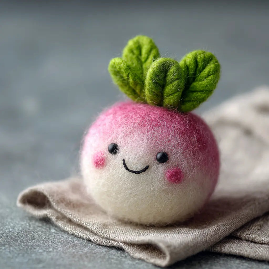 The design features a plump, spherical radish body with a vibrant pink-to-white gradient finish. It is crowned with lush, layered green felt leaves and features a delightful hand-stitched smiling face with rosy blushing cheeks. Because each piece is individually handmade, the radish’s friendly expression and the subtle blending of its organic colors are one of a kind. Whether displayed as a seasonal kitchen accent, part of a nature-inspired nursery, or given as a charming gift for a gardener, this is a tiny work of art designed to be a cherished keepsake.