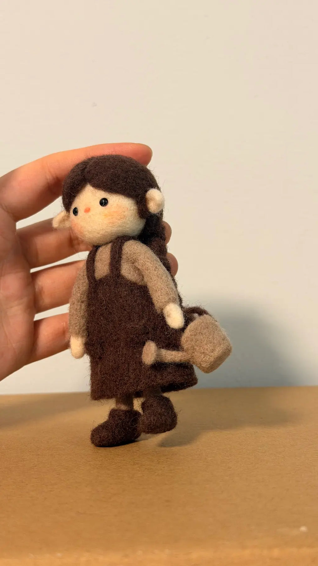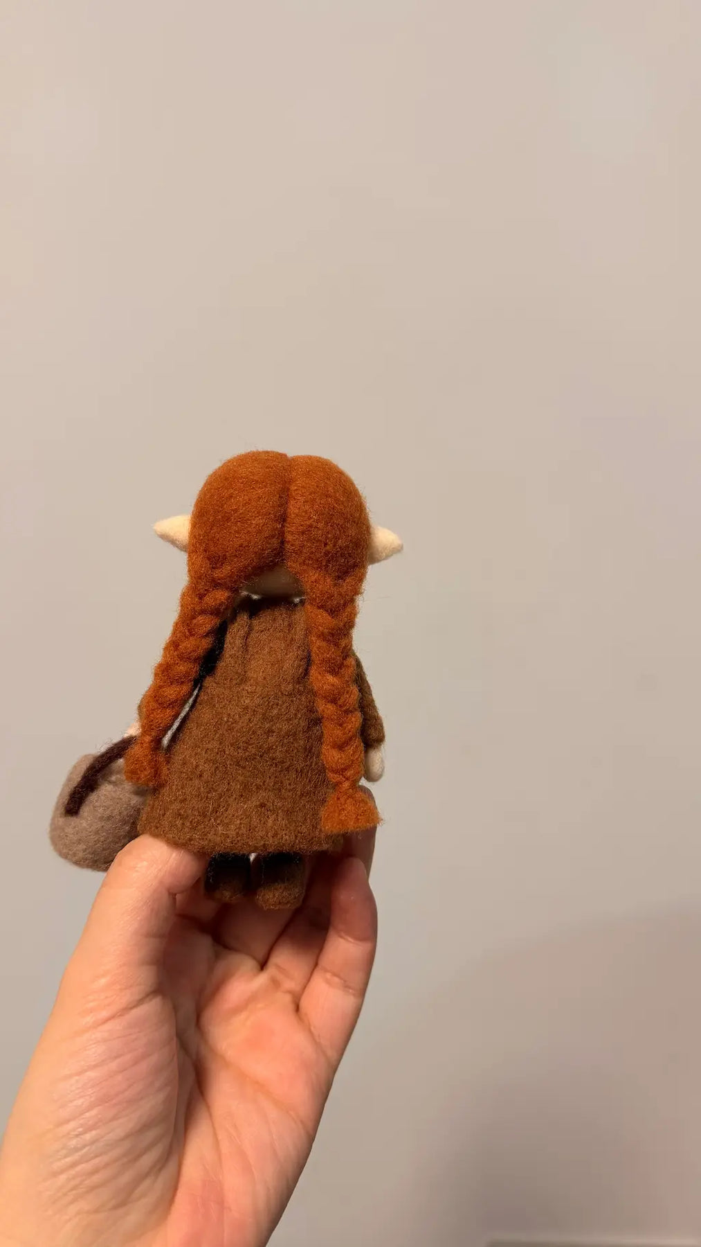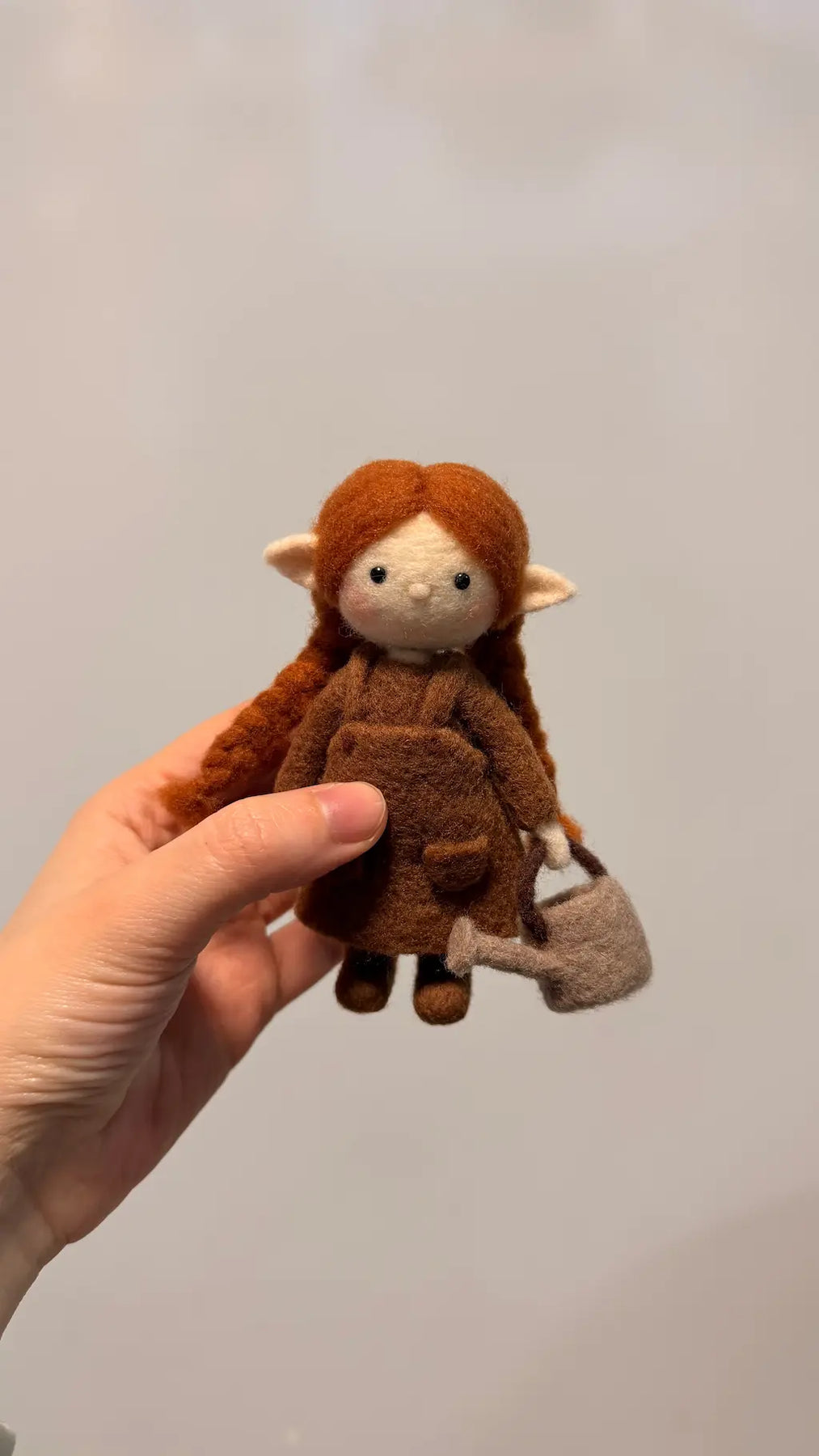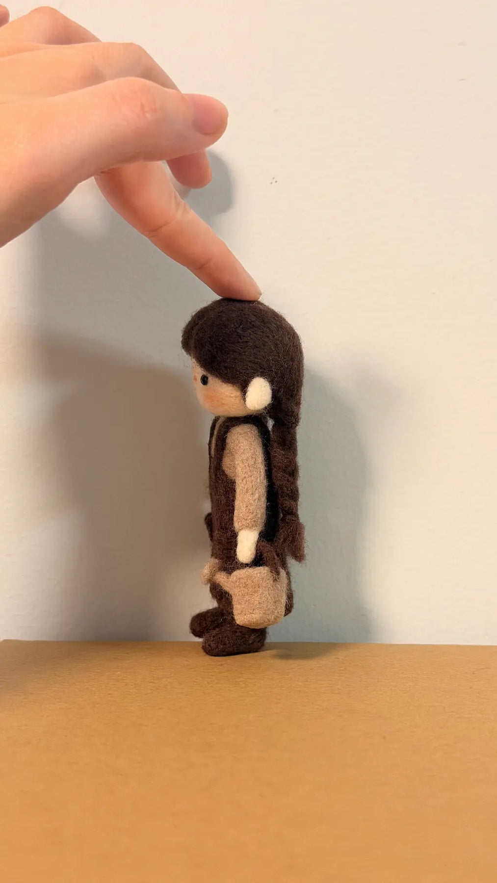 Small felt doll with brown hair, dress, and shoes held by a hand against a plain background