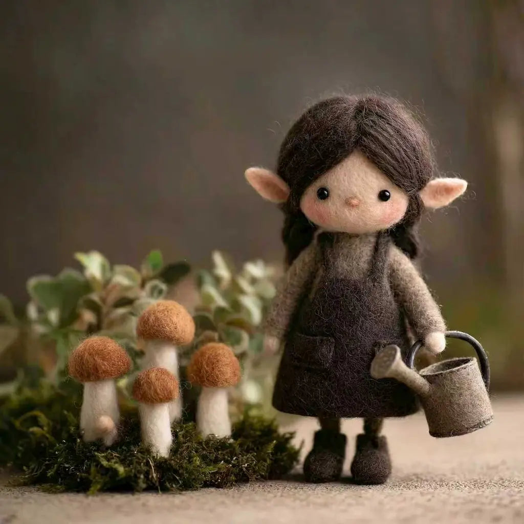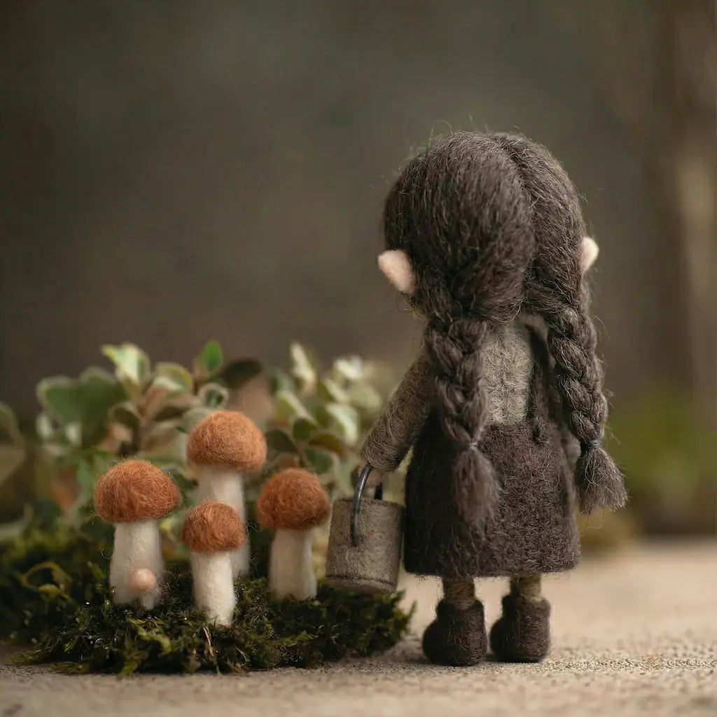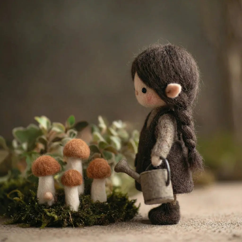 Felted elf doll with a watering can standing next to mushrooms in a forest setting