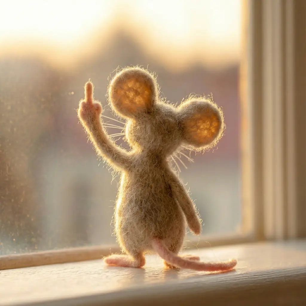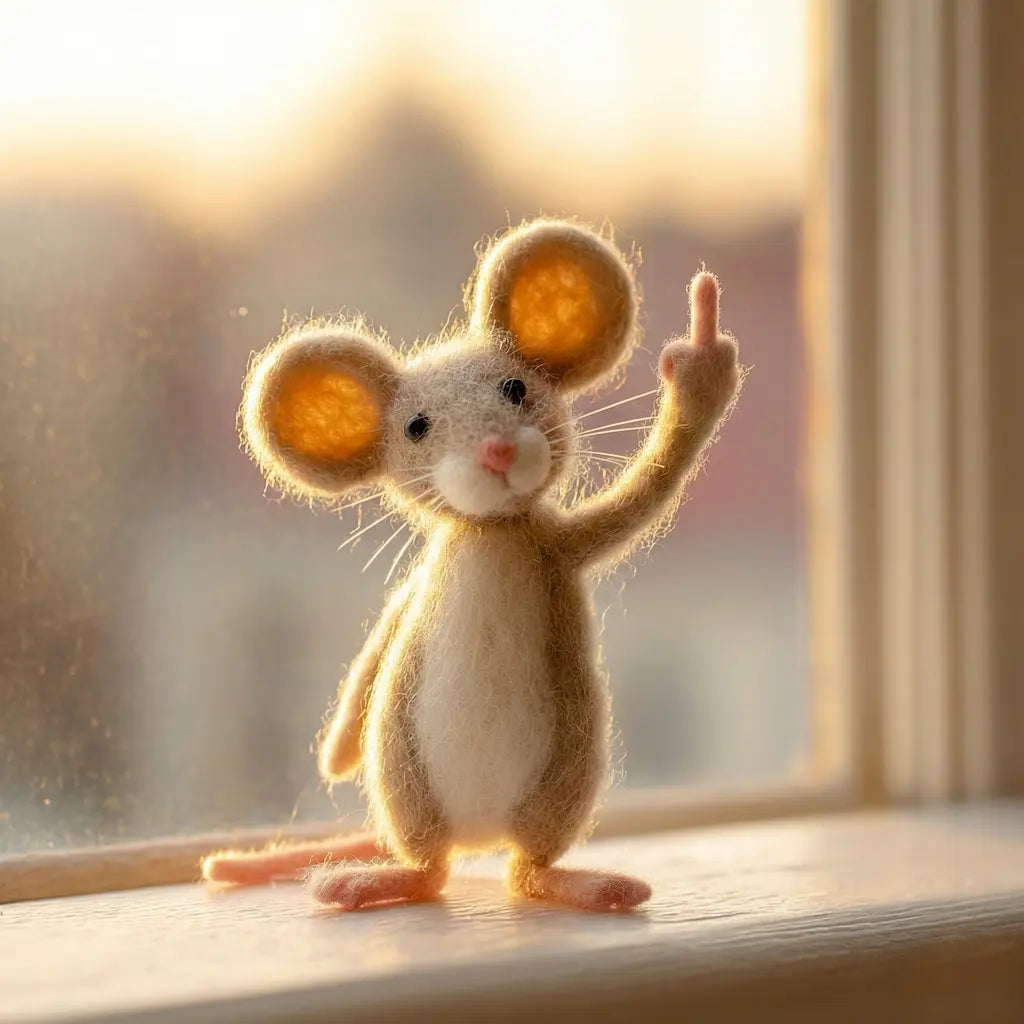 Small Size, Big Attitude. Sometimes, you just need to let the world know how you really feel without saying a word. Meet the OakenArk Little Rebel—a whimsical handcrafted mouse who may look soft and fuzzy, but carries a bold, sassy personality. With his oversized ears glowing in the sunlight and a defiant gesture held high, he is the perfect mascot for those days when you've had just enough.