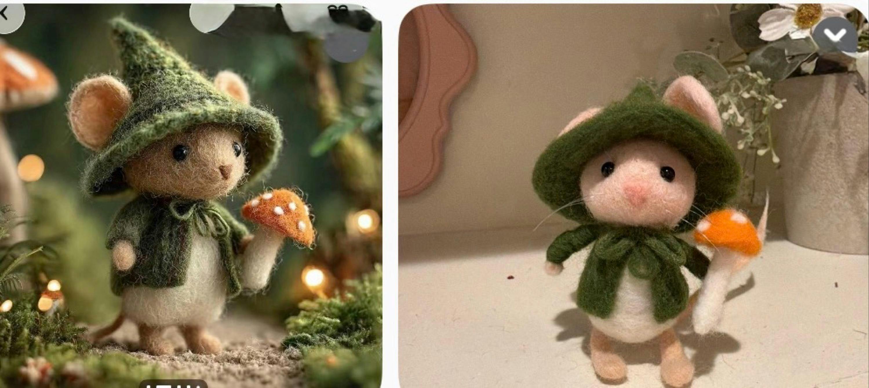 A Little Forest Wanderer. Dressed for a woodland adventure, this enchanting handcrafted felt mouse brings a touch of fairytale magic to your home. He wears a textured rust-red pixie hat and a cozy beige scarf wrapped snugly around his neck. With wide, innocent eyes and oversized ears, he looks like a gentle character straight out of a storybook. A heartwarming gift or a sweet addition to your nature-inspired decor.