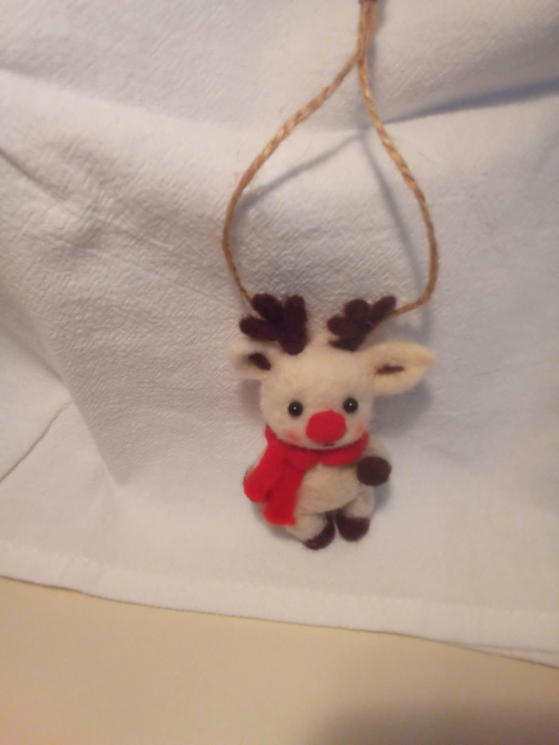 All Dressed Up for Christmas. Celebrate the season with this festively attired handcrafted felt reindeer. Ready for the cold, he wears a cozy green scarf and cute red mittens. With a bright red Rudolph nose and holding a sprig of traditional holly, he brings a bundle of holiday cheer to your tree. Suspended from a rustic twine loop, this detailed ornament is a joyful addition to any Christmas collection.